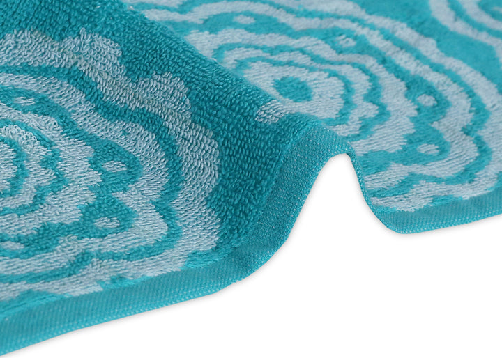 Our bath towel is crafted from premium, highly absorbent 100% Cotton, offering a wonderfully soft and plush texture that feels incredibly gentle against your skin. Its vibrant Aqua Blue base is beautifully contrasted with an intricate White Blossom Pattern, creating a stunning visual appeal. This elegant design makes it not just functional, but also a decorative accent for your bathroom.