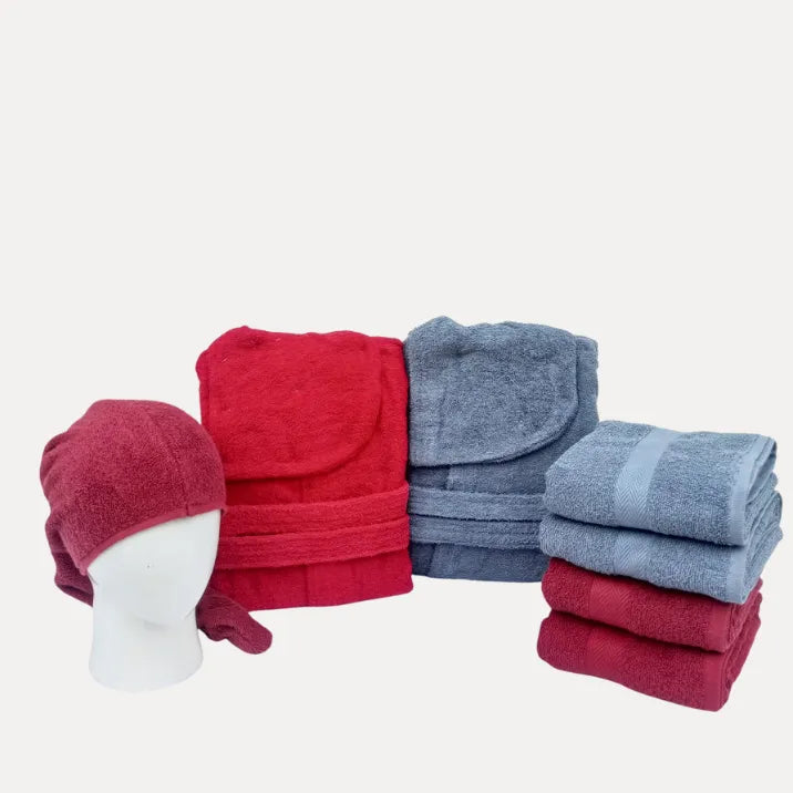 - Complete Set: A convenient bundle of matching bathrobes and towels for two.