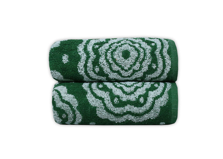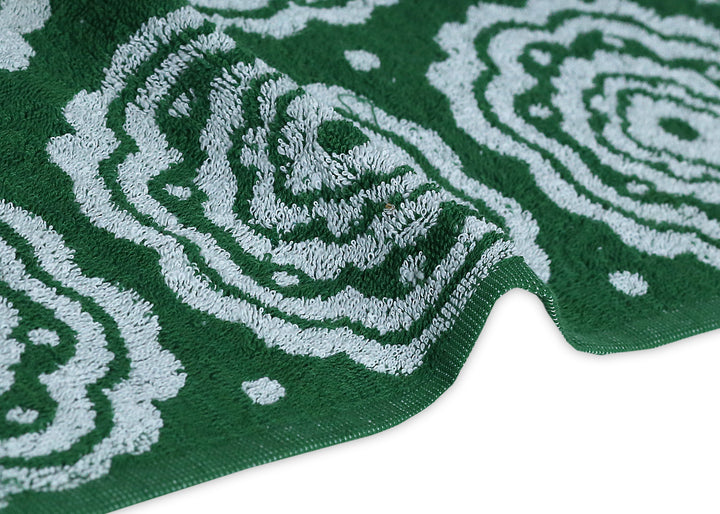 Our bath towel is expertly crafted from premium, highly absorbent 100% Cotton, offering a wonderfully plush and gentle texture that feels luxurious against your skin. Its deep Emerald Green base provides a striking, jewel-toned contrast to the intricate White Bloom Pattern, creating a stunning and refined visual effect. This sophisticated design makes it both a high-utility item and a beautiful decorative accent.