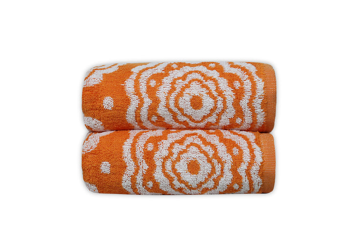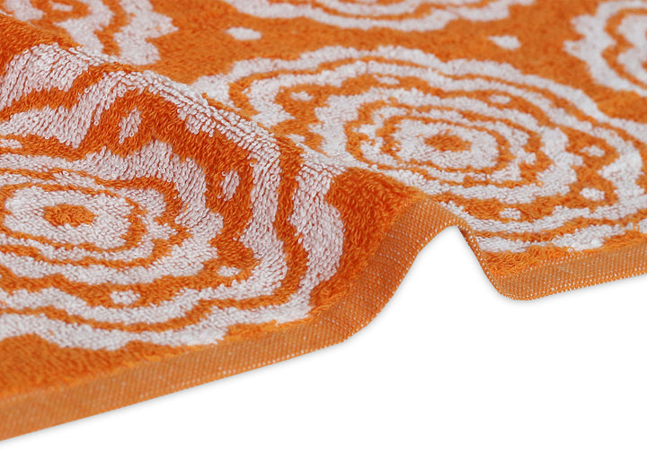Our bath towel is crafted from premium, highly absorbent 100% Cotton, offering a wonderfully soft and plush texture that feels incredibly gentle against your skin. Its lively Sunset Orange base is dramatically contrasted with an intricate White Bloom Pattern, creating a stunning visual effect. This elegant design makes it not just functional, but a decorative focal point for your space.